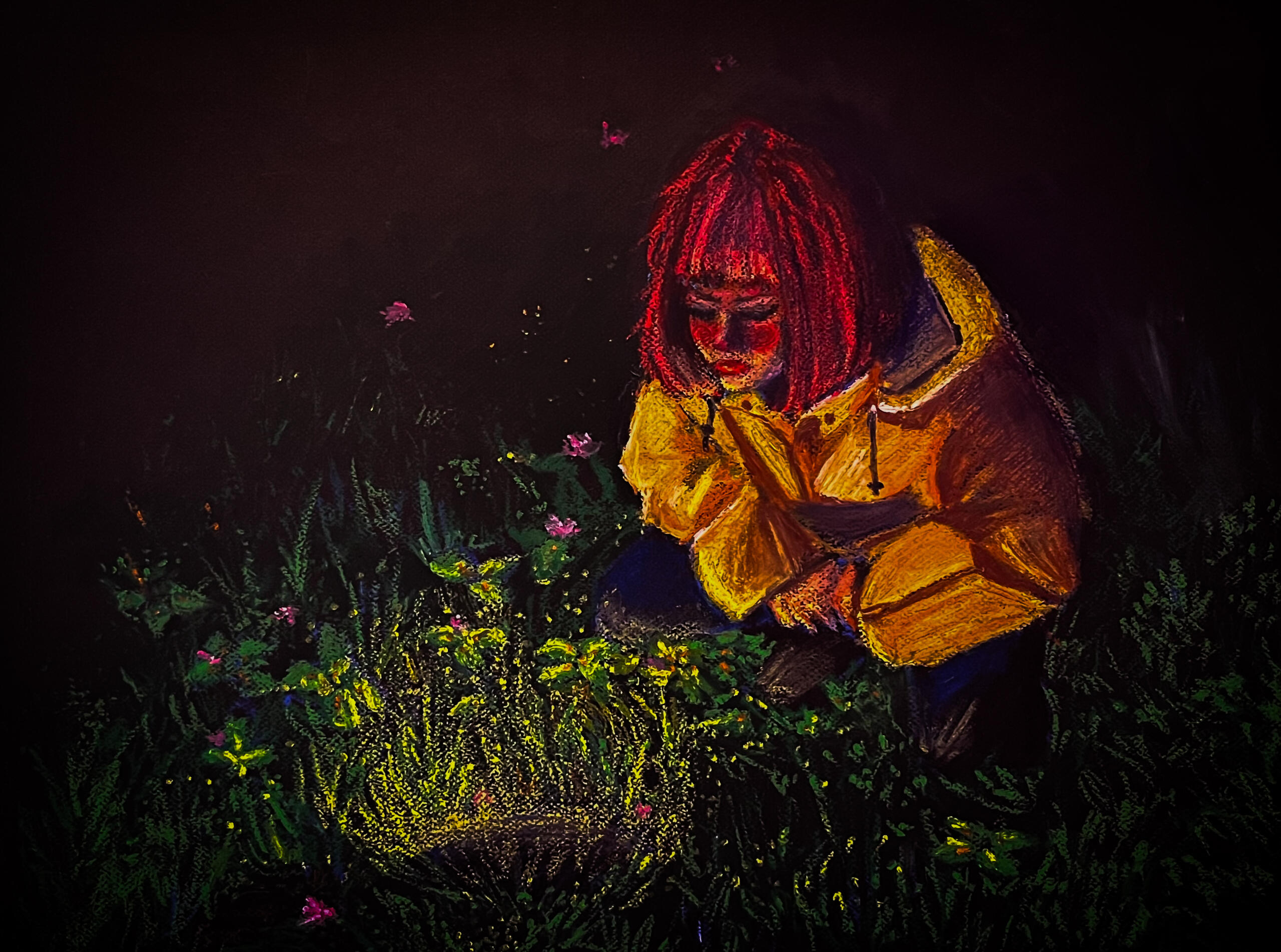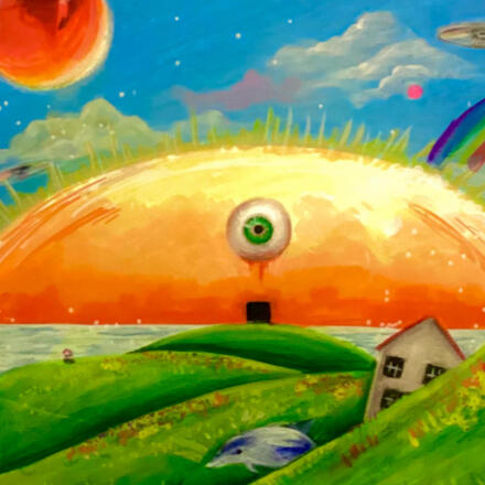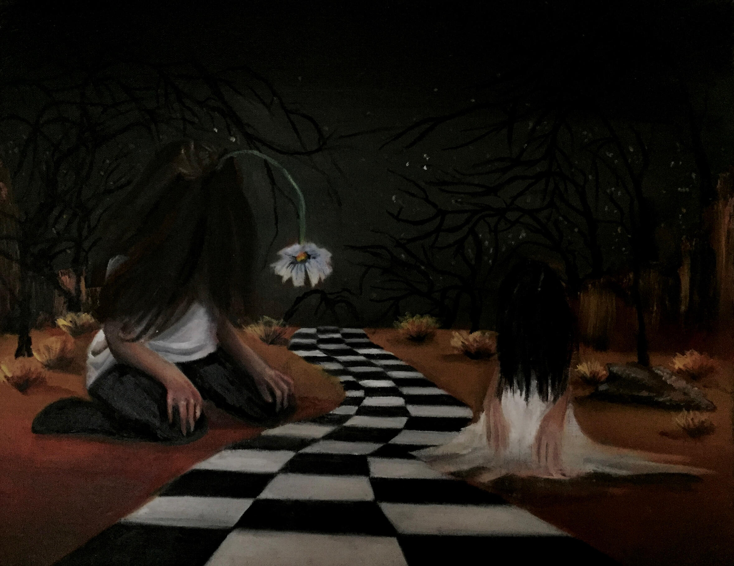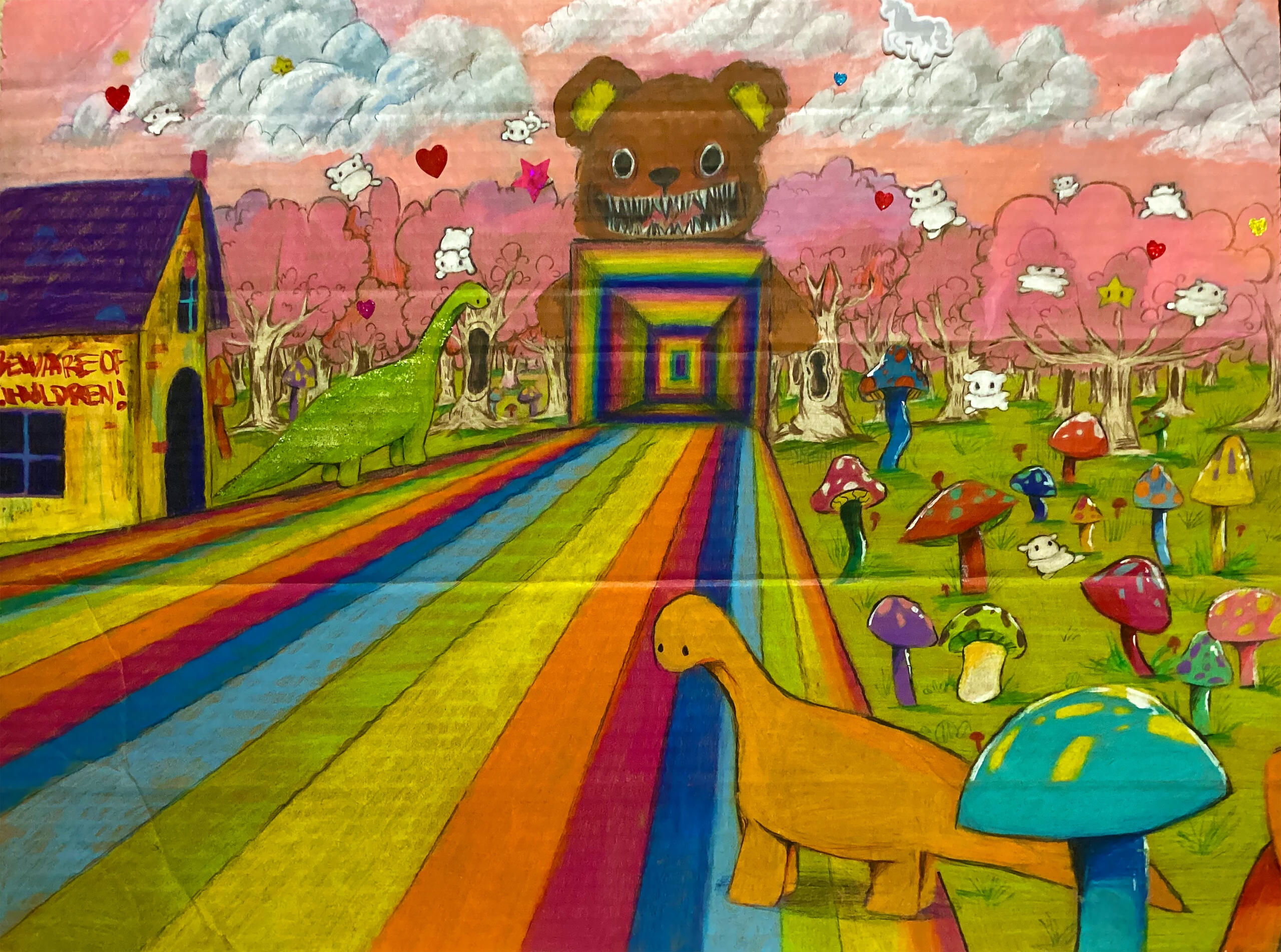 I am an artist and designer based in Nevada, working in mixed media and illustration to build worlds that reflect my identity and background. My work combines low-fi, psychedelic visuals and bold colors to create a sense of confusion, nostalgia, and uneasiness. Influenced by surrealism and cosmic horror, I explore reincarnation, memory, and the idea of past selves.What if I’d made different choices? What if I wasn’t human? These questions shape my work, using a red haired girl as an alter ego to examine the tension between fear and curiosity. My results are unsettling, dreamlike pieces that blur reality.